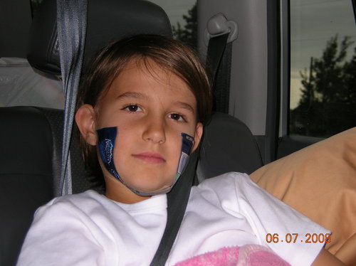 #1 gets so bored she stabilizes her "broken jaw" with an Aquafina label.