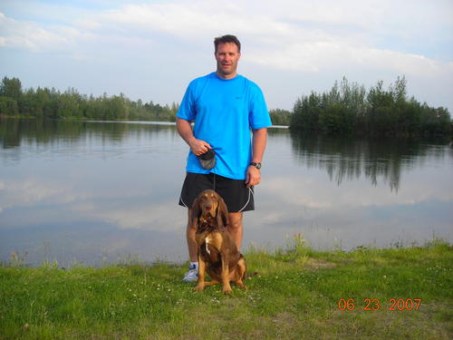 Brad and Lucy pose in front of Moose Lake. EAFB, AK.