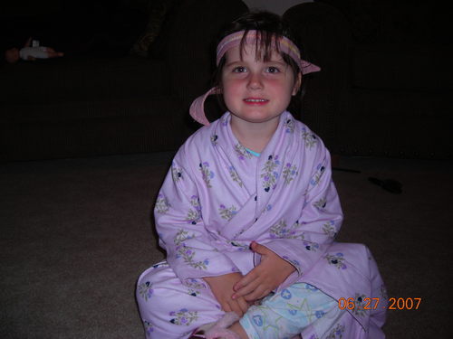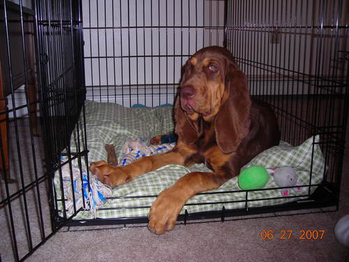 Lucy shows off her new bed. Her treat for being housetrained (then she went pee in my car tonight after being outside at T-ball practice for 1 1/2 hours!).