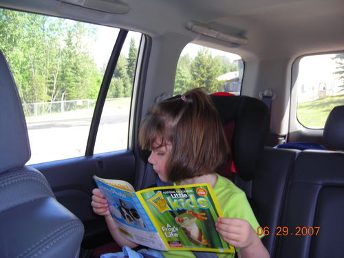 Meghan "reads" her new National Geographic. Thanks Nana and Poppi!