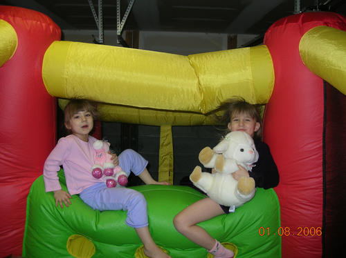 Allison and friend fight static in the Super Jumper - Sundog Court garage Jan 2006