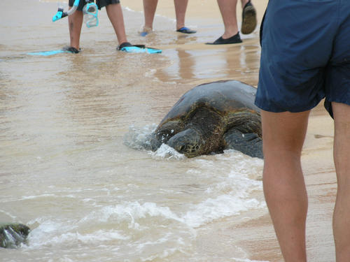 Turtle comes ashore for a photo-op, then turns and swims away. Poipu Beach, Kauai.